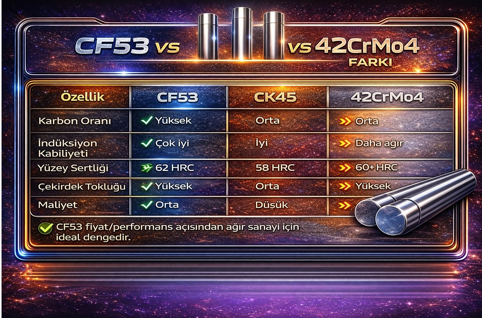 CF53 daha yüksek karbon oranına sahiptir ve indüksiyon sonrası daha derin sertlik sağlar. CK45 genelde 58 HRC seviyesine çıkarken CF53 62 HRC seviyelerine ulaşabilir ve ağır yük uygulamalarında daha uzun ömürlüdür.