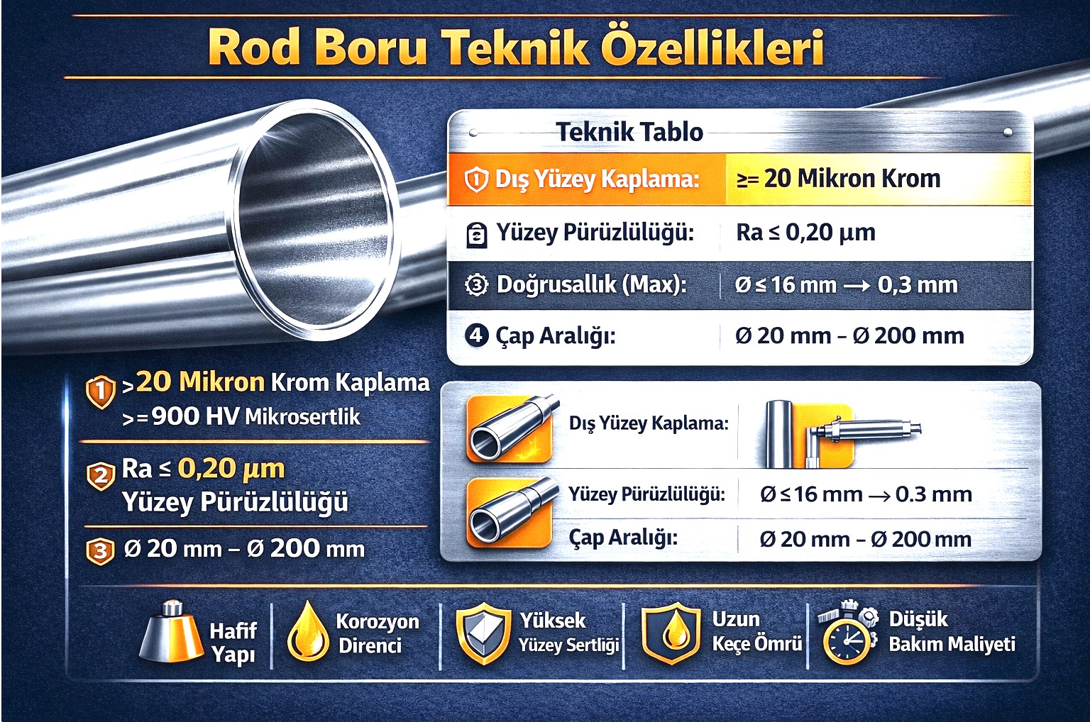 Mükemmel bir dış yüzeye sahip olması için St52 (E355 vb.) dikişsiz çelik yapıdan çekilen bu borular, dış yüzeyi hassas taşlandıktan sonra Sert Krom ile (standart 20µm) kaplanmaktadır.